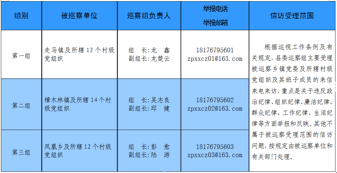巡察期间,为便于党员干部群众反映情况,巡察组将安排专人负责接待群众来信来访,同时开通信访举报电话、邮箱,受理投诉、举报。各巡察组负责巡察村级的党组织、巡察组负责人和举报电话如下:
