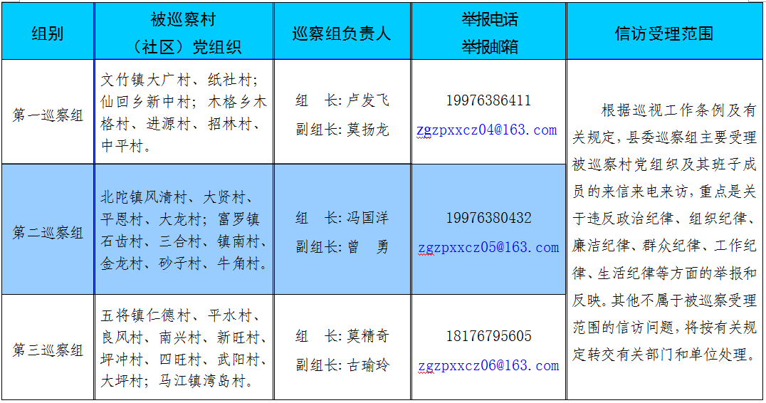 巡察期间,为便于党员干部群众反映情况,巡察组将安排专人负责接待群众来信来访,同时开通信访举报电话,受理投诉、举报。各巡察组负责的巡察村(社区)党组织、巡察组负责人和举报电话如下: